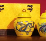 有一只龙罐,一只凤罐,罐子的设计体现了威严与尊贵,选用帝王黄为罐体颜色。