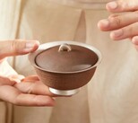 整体古拙的盖碗,点缀银白色的提溜,相得益彰,拙中有细。