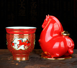 一只陶瓷珐琅转心主人杯搭配大红吉祥马摆件的马年限定套装,祝你马上赚大钱!