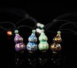 其中葫芦吊坠更为巧思,当葫芦身髹涂百层不同色漆,层层叠叠形成如云似霞、变幻无穷的流畅纹理 ,却又在这极致绚烂的纹理之眼均匀嵌上彩色贝母,多一片则俗,少一分则寡。