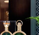 外包装高透的亚克力水晶,四周镀金装饰,如同为美酒打造了一座晶莹剔透的殿宇,衬托出内部鎏金瓶身的璀璨光泽。